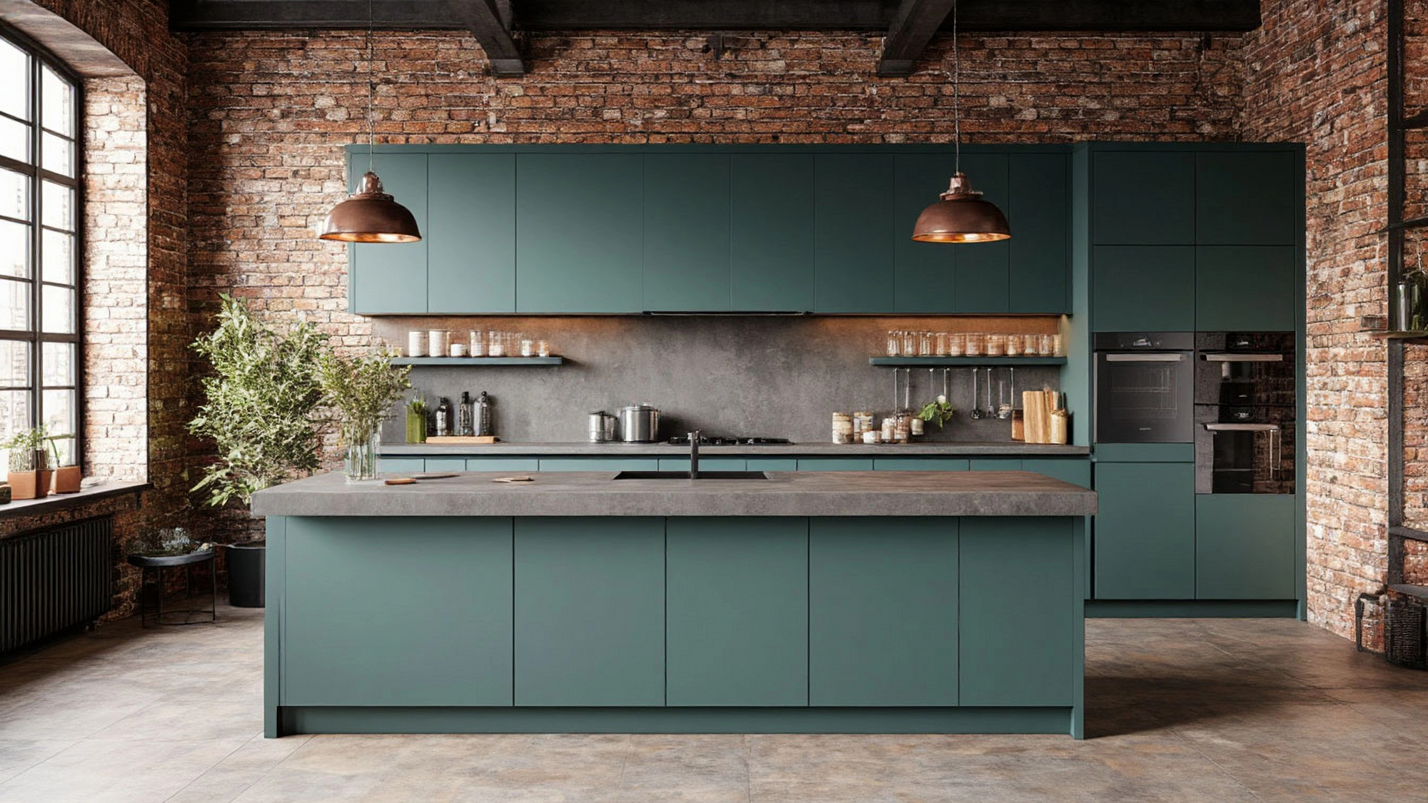 Особое внимание в проекте уделено композиции. Гарнитур выстроен таким образом, чтобы сохранить ощущение открытого пространства, характерного для лофта. Верхние шкафы вытянуты в единую горизонтальную линию, создавая ощущение монолитного объёма, который словно встроен в архитектуру помещения. Нижние модули и остров визуально уравновешивают композицию, формируя чёткий центр кухни, вокруг которого удобно организовать рабочие процессы и общение. Остров становится не только функциональным элементом, но и важной частью образа: его строгие формы и тот же глубокий зелёно-синий оттенок поддерживают целостность дизайна.