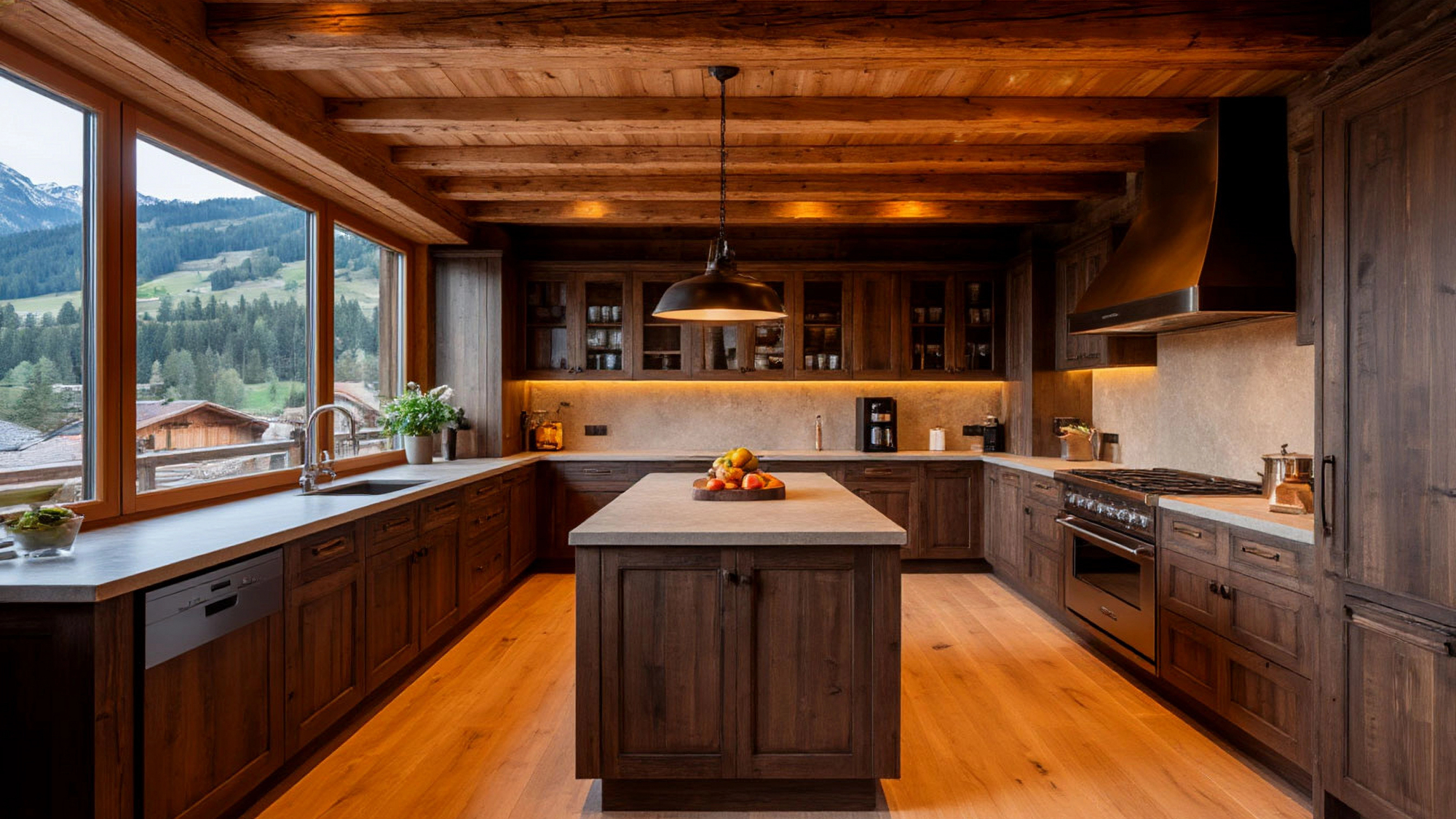 Кухня "Смола" сразу задает особый характер пространству. Темные древесные оттенки ассоциируются с хвойным лесом, смолистыми стволами, теплом натурального дерева и спокойствием горного дома. Этот цвет не выглядит тяжелым или мрачным — напротив, он воспринимается как насыщенный, теплый и благородный. В сочетании с мягким освещением и натуральными фактурами кухня становится уютной и камерной, даже если помещение имеет внушительные размеры. Темно-коричневая палитра помогает создать ощущение уединения и защищенности, что особенно ценится в интерьерах в стиле шале.